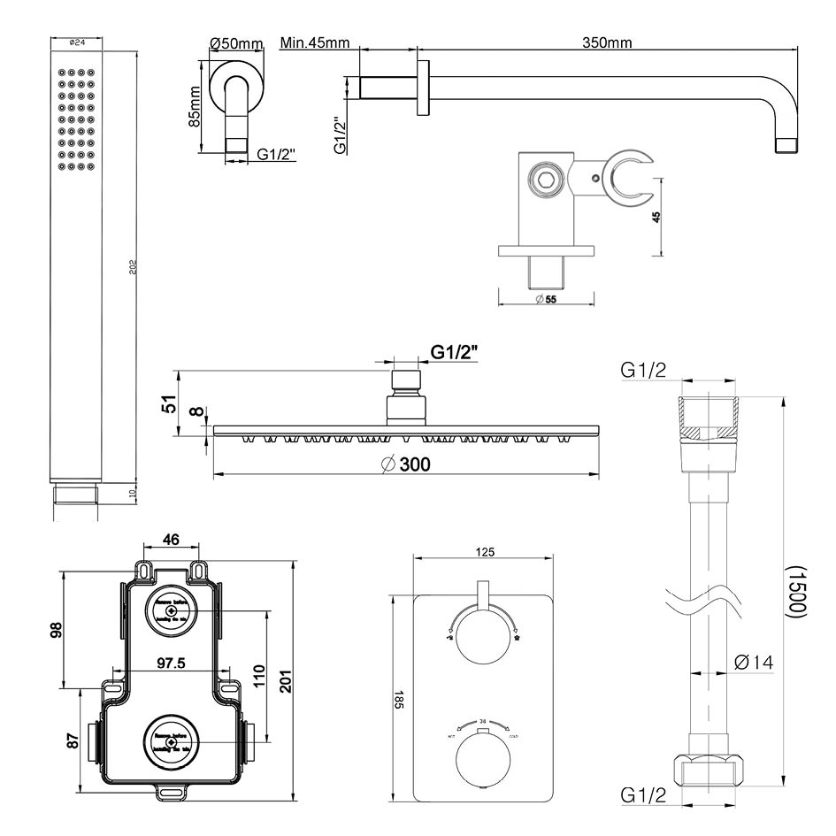 Caral inbouwthermostaat compleet met hoofddouche 30 cm, staafhanddouche, doucheslang en -arm geborsteld staal