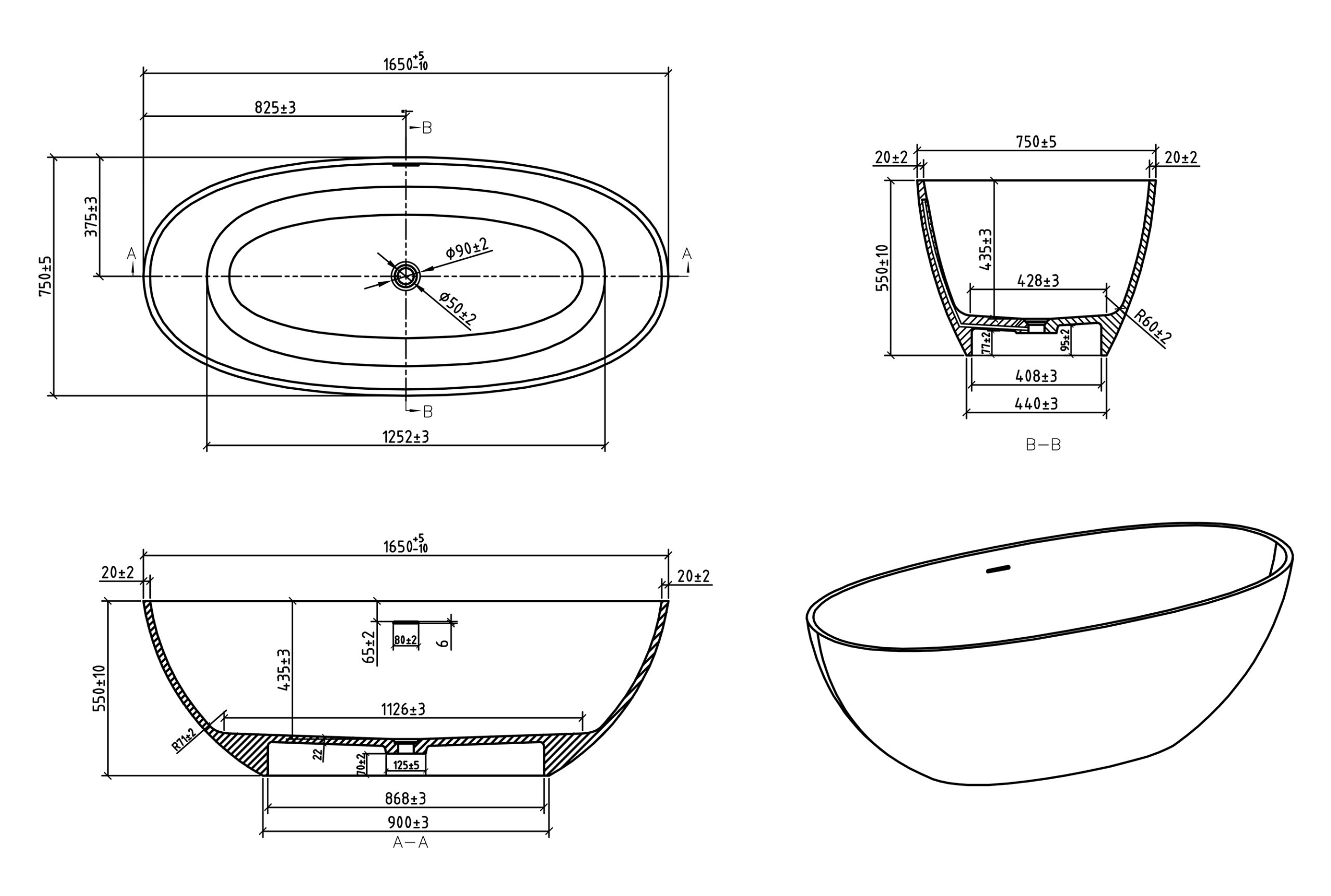 Dit vrijstaande ligbad is 165 cm lang en 75 cm breed.