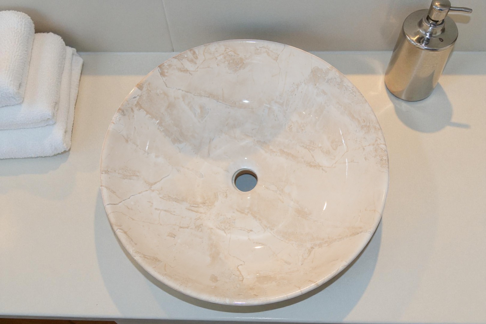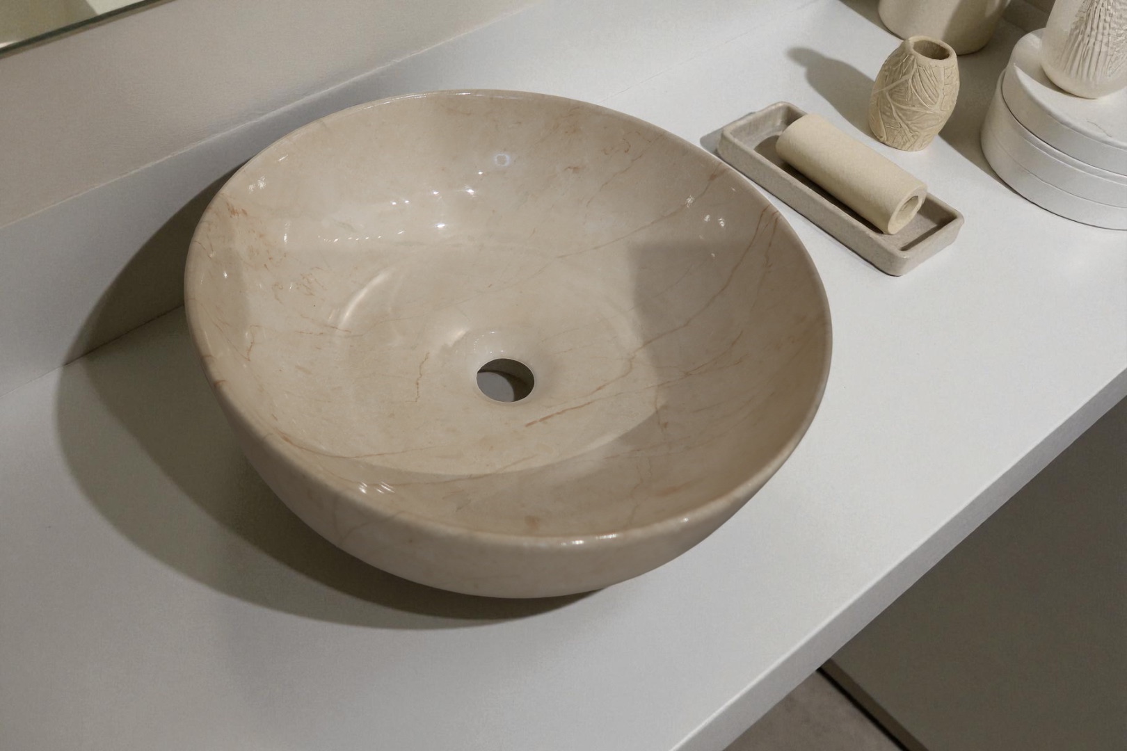 De licht taupe marmerlook waskom brengt rust en verfijning in de badkamer. Met zijn subtiele marmerstructuur en tijdloze uitstraling past hij perfect in elk modern interieur.