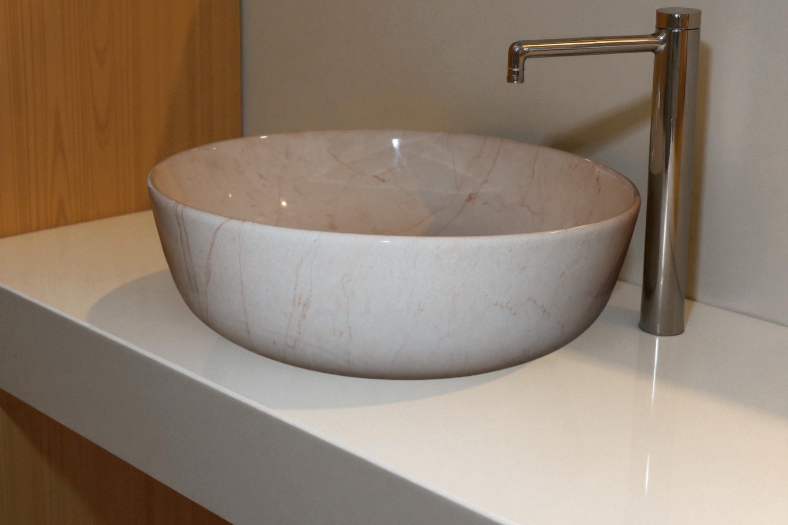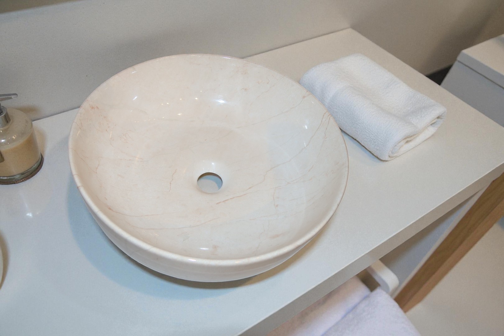 De taupe marmerlook waskom combineert een natuurlijke uitstraling met modern design. De zachte tint en marmerstructuur creëren een warme, elegante sfeer, terwijl het gladde, duurzame oppervlak eenvoudig te reinigen is. Perfect voor een verfijnde badkamerstijl!