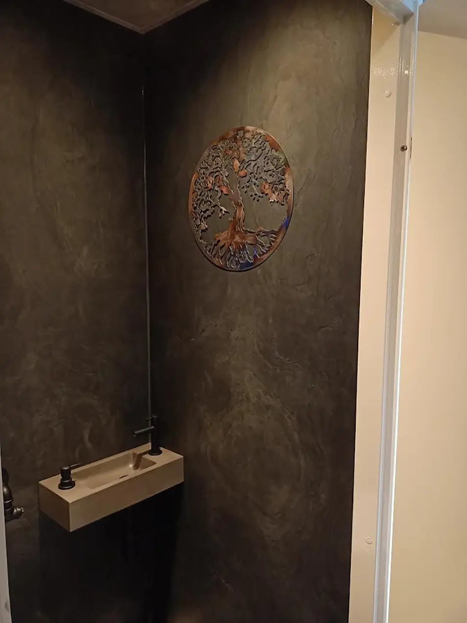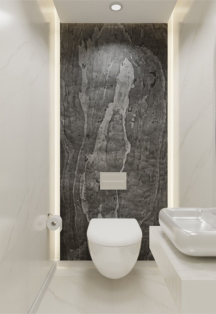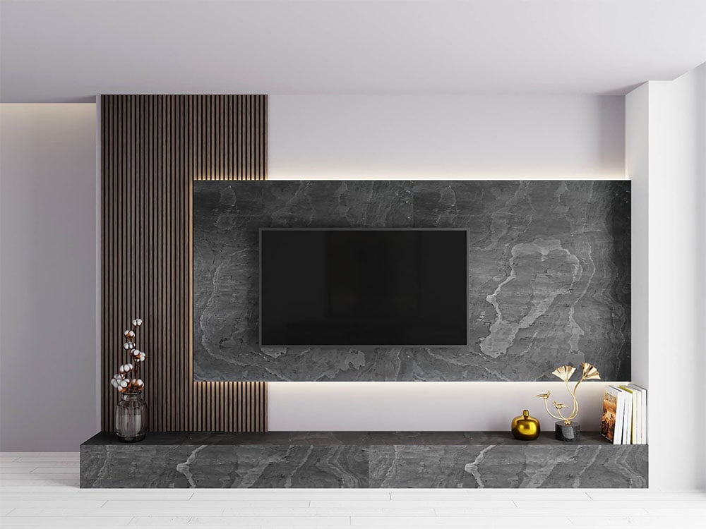 Natuursteen platen Artistiek Carbon Zwart gemaakt van echt 100% natuursteen. Een onderlaag van polyester versterkt met glasvezel en daardoor extra flexibel. De toplaag bestaat uit onbewerkt natuursteen en daardoor heeft iedere plaat een eigen structuur en kleurschakeringen. Deze natuursteen platen kunnen overal geplaatst worden en vereisen geen speciale voorbehandeling. Uitstekend geschikt voor badkamers, toiletten, buitengevels, open haarden, cinewalls en alle overige plaatsen. De natuursteen platen geven een zeer elegante, luxe uitstraling. Ultra dun, slechts ca. 1,0 – 2,5 mm. Doordat het is gemaakt van echt natuursteen is iedere plaat uniek. Dit betekent dat een natuursteen plaat in meer of mindere maten kan afwijken in kleurschakeringen en patronen. Dit laatste geeft het product juist haar authentieke karakter.