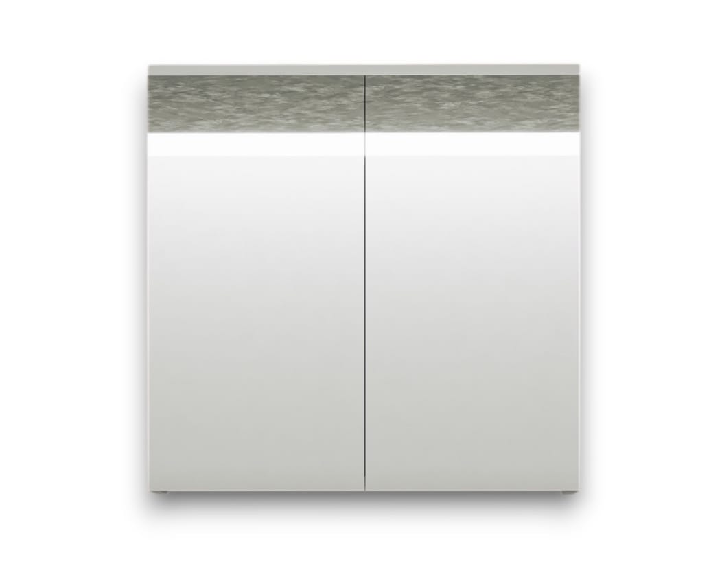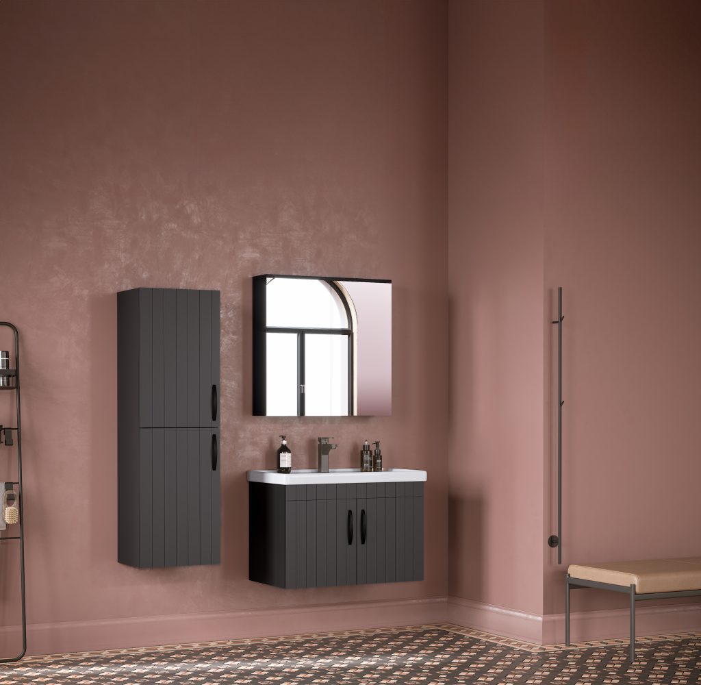 De badkamermeubel set ‘Stillo’ van Neff Line bestaat uit membraan CNC- bewerkte deuren streepjes, een spiegelkast en hoge kolomkast. De set is uitgerust met soft close deuren en en een keramische wastafel.