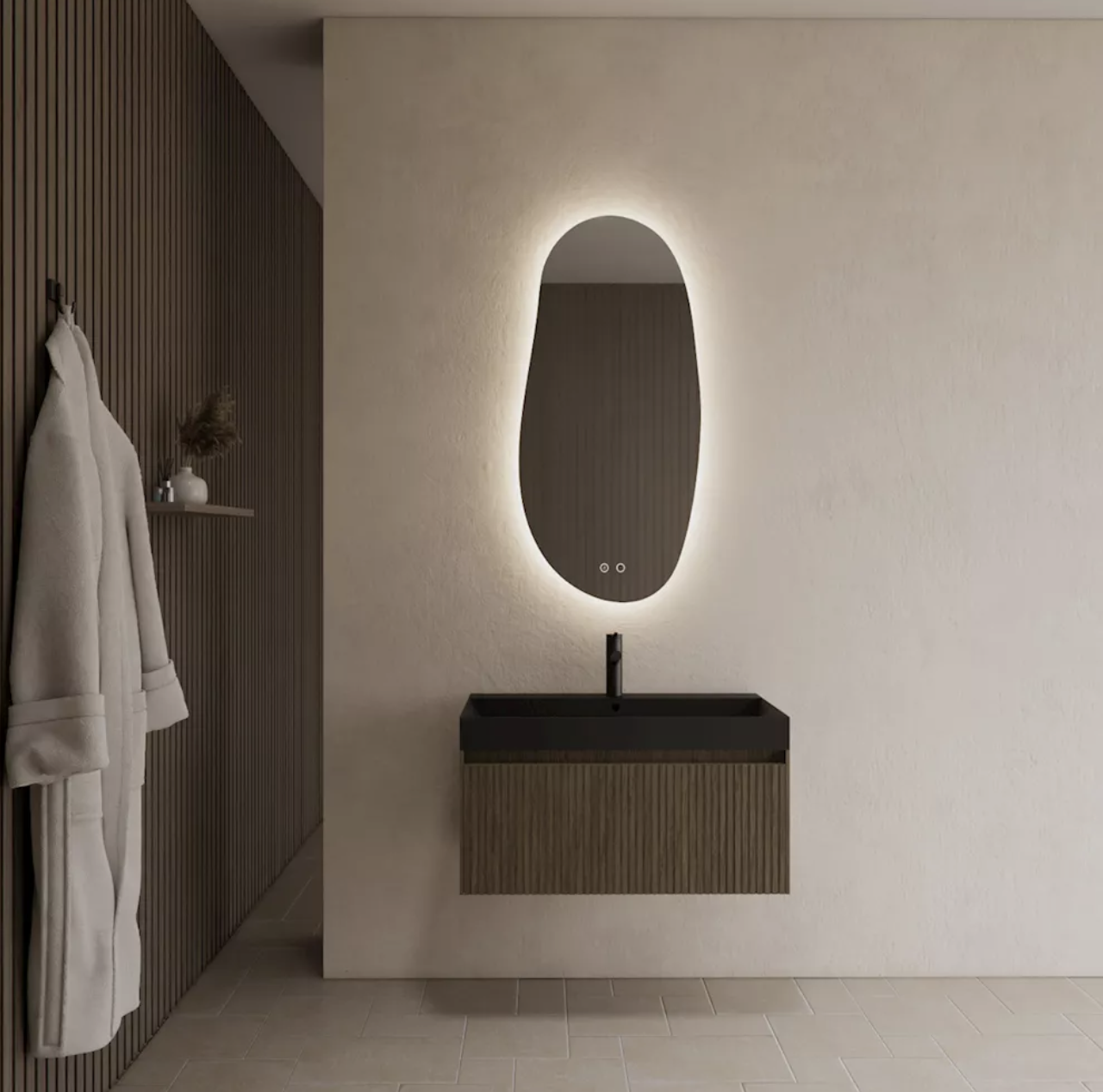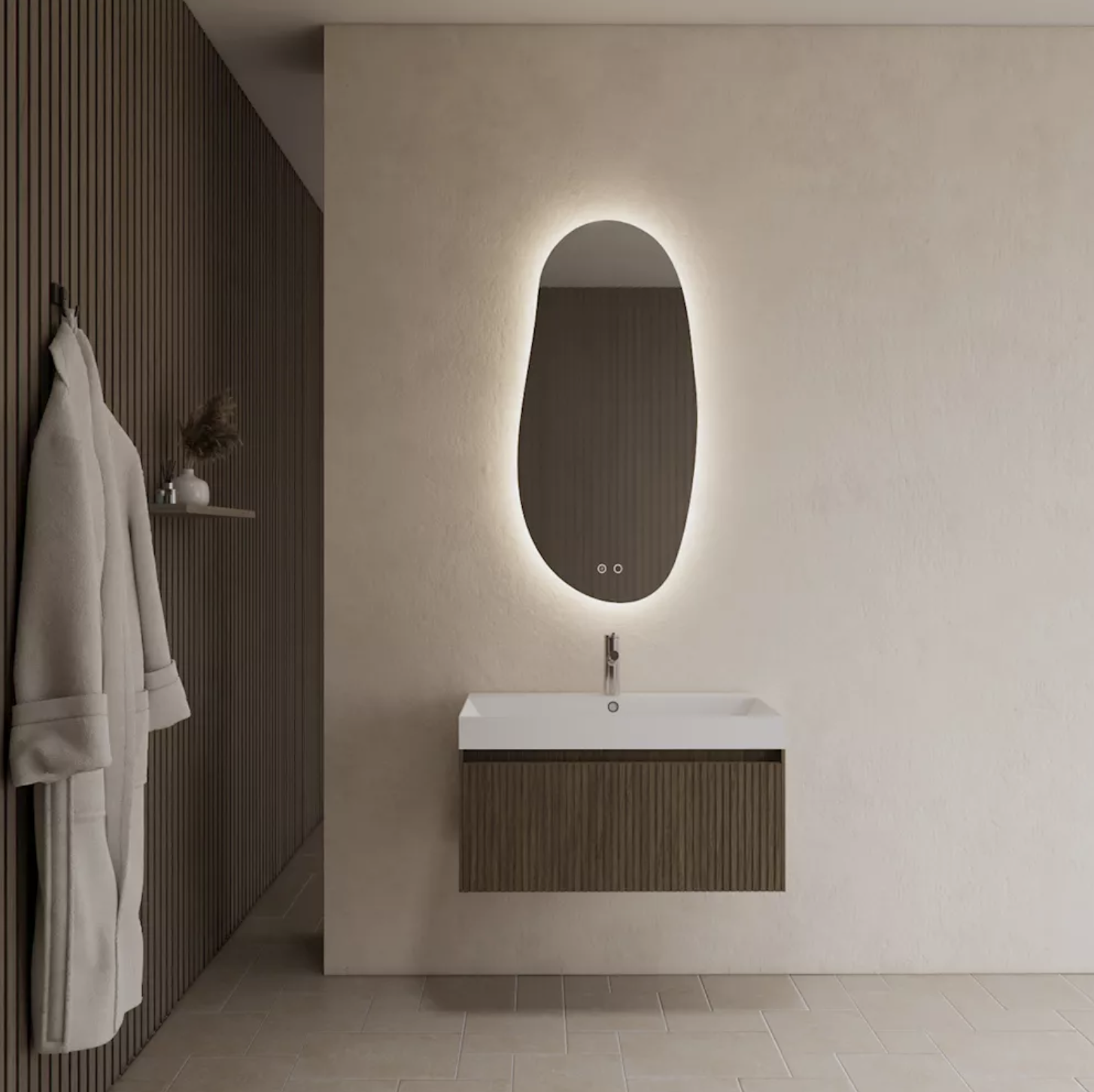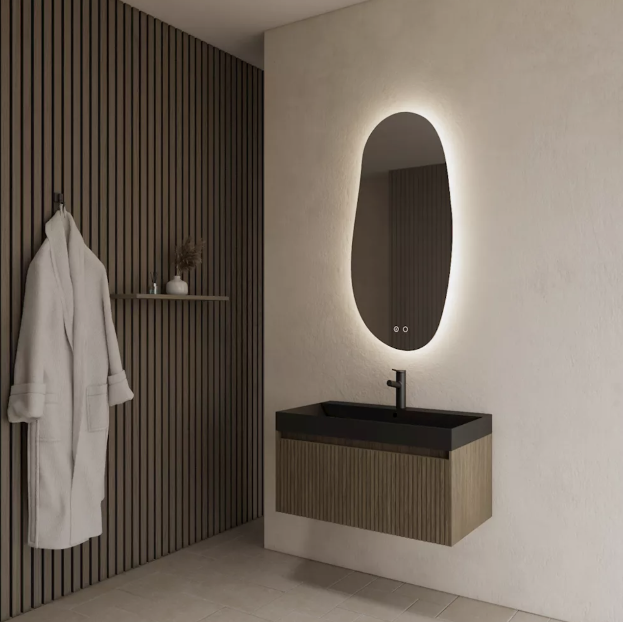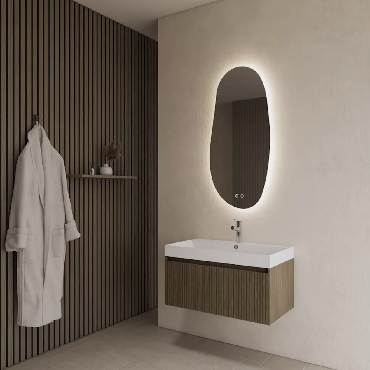 De uitvoering in Ash Grey legt de nadruk op de natuurlijke houtstructuur en brengt een moderne, koele sfeer in de badkamer.